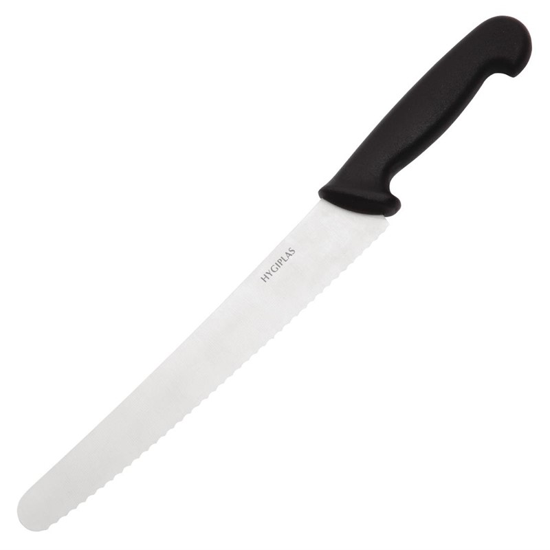 Dit hoge kwaliteit gekartelde bakkersmes van Hygiplas is vaatwasserbestendig en eenvoudig te slijpen. Met zwart nylon heft voor een comfortabele grip en ideaal voor het snijden van gebak en taart.