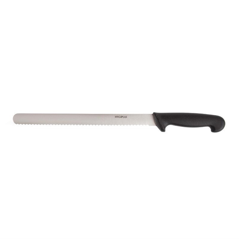 Goede kwaliteit gekarteld hammes van Hygiplas. Vaatwasserbestendig en eenvoudig te slijpen, met zwart nylon heft voor een comfortabele grip. Dit hammes is ideaal voor het snijden van vlees en brood.