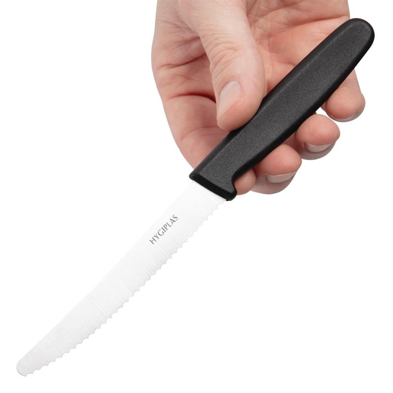 Dit hoge kwaliteit gekartelde tomatenmes van Hygiplas is vaatwasserbestendig en eenvoudig te slijpen. Met zwart nylon heft voor een comfortabele grip en ideaal voor het snijden tomaten zonder ze te kapot te drukken.