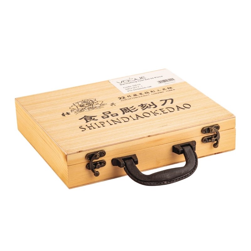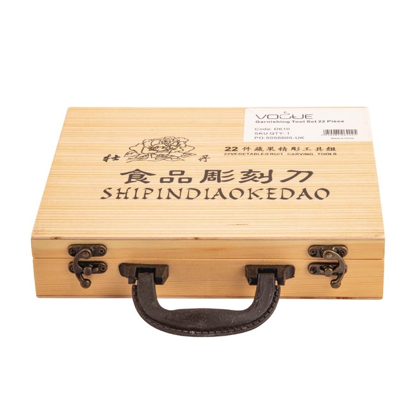 Deze 22-delige garneerset bevat divers garneergerei, messen en decoreermessen. Deze hoge kwaliteit set bevat verschillende mesjes, schilmesjes en ook een decoreermes voor groente en fruit, dubbele groente en fruit boor, vogelsnavelmes, puntige en vlakke schiller en ribbelsnijder. Gepresenteerd in een aantrekkelijke en lichtgewichte koffer.