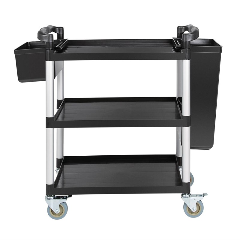 Deze zwarte serveerwagen heeft een sterk frame en is gemaakt van robuust polypropyleen. De serveerwagen is zeer duurzaam en geschikt voor gebruik in hotels, restaurants, cafés en andere horecagelegenheden en kan op verschillende plekken ingezet worden. Afval- en bestekbak worden apart verkocht.